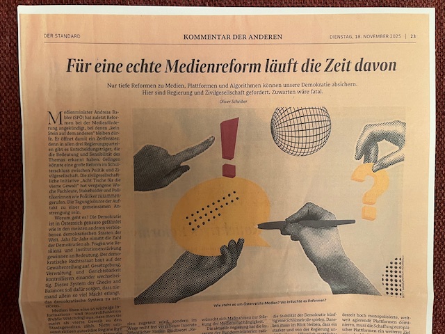Reform der Medienförderung, Regulierung von Social-Media-Plattformen und des Einsatzes von Algorithmen: Für die Regierung verbleibt wenig Zeit, hier eine grundlegende Neuordnung zur Sicherung der Demokratie in Österreich zu schaffen. „Geborgte Zeit“ nennt die Politologin Maria Mayrhofer in einem gleichnamigen Essay diese wenige Zeit, jene Atempause, die Österreich durch die Bildung der Dreierkoalition im März 2025 erhalten hat. Sie gehört genutzt. (Oliver Scheiber, 18.11.2025)